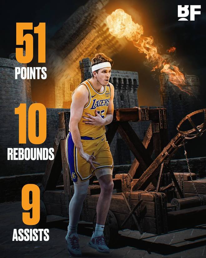本場比賽,里夫斯打出生涯之夜,首發(fā)出戰(zhàn)39分鐘,22投12中,三分球10投6中,罰球22罰20中,得到51分10籃板9助攻2搶斷,正負值+22,一戰(zhàn)轟下多個紀錄。首先,這是里夫斯生涯得分新高,也是湖人本賽季首個50分。此外,里夫斯成為湖人隊史第八位單場砍下50分10籃板的球員,并成為自1954年的尼爾-約翰斯頓以來首位拿到“50分兩雙”的落選秀球員。這也是NBA歷史上落選秀球員第4次單場50分。